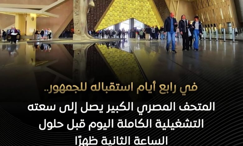 إقبال استثنائي على المتحف المصري الكبير يؤكد مكانته كأيقونة حضارية لمصر، ووجهة تجمع بين عظمة التاريخ وروعة التجربة المتحفية الحديثة. وصل المتحف إلى طاقته التشغيلية الكاملة في رابع أيام استقباله للجمهور، ما استدعى وقف بيع وحجز تذاكر الدخول لليوم 7 نوفمبر 2025 قبل حلول الساعة الثانية ظهرًا. ويؤكد المتحف أن الحجوزات المؤكدة مسبقًا عبر قنوات الحجز المختلفة سارية، وسيستقبل حاملوها كالمعتاد. كما يمكن حجز التذاكر مستقبلًا عبر الموقع الرسمي www.gem.eg.