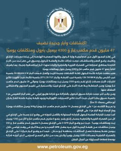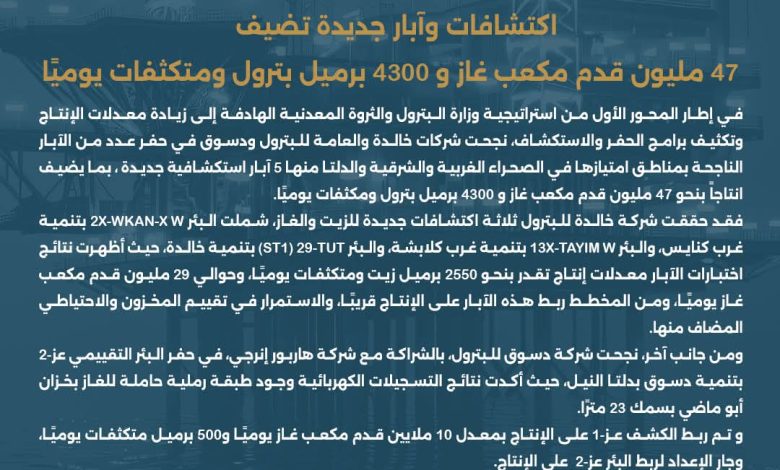 اكتشافات وآبار جديدة تضيف 47 مليون قدم مكعب غاز و 4300 برميل بترول ومتكثفات يوميًا