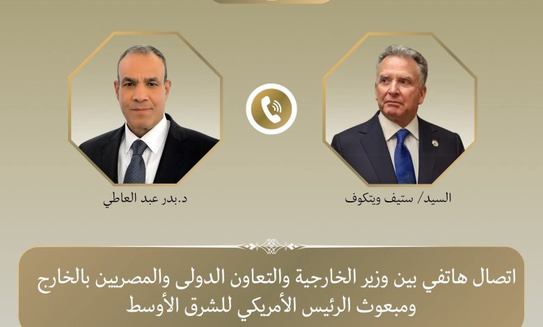 تلقى د. بدر عبد العاطي وزير الخارجية والتعاون الدولي والمصريين بالخارج اتصالًا هاتفيا يوم الاثنين ٢٧ أبريل من السيد ستيف ويتكوف المبعوث الأمريكي الخاص للشرق الأوسط، وذلك للتشاور حول مسار المفاوضات الأمريكية – الإيرانية والجهود المبذولة لخفض التصعيد فى المنطقة.